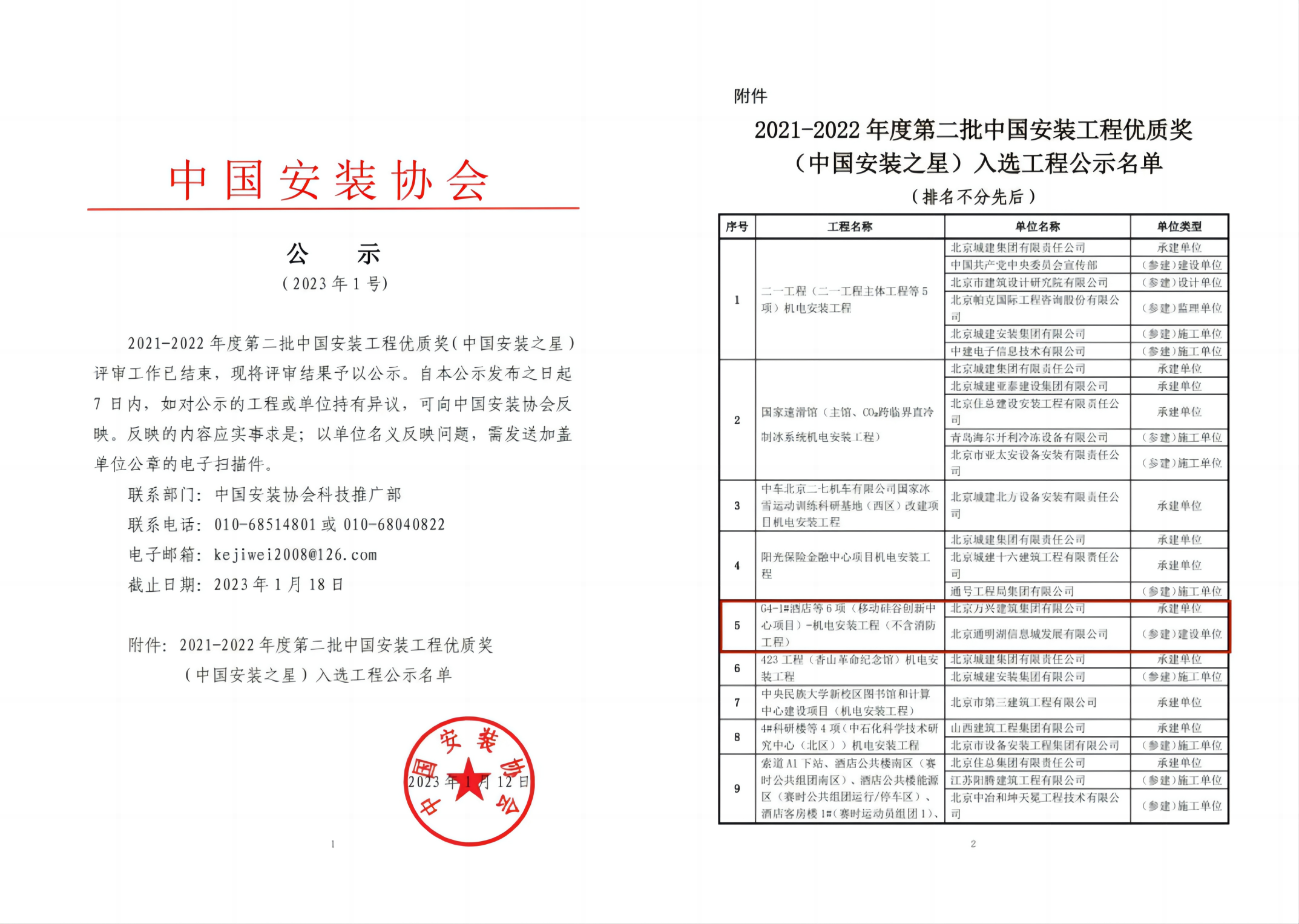 近日,中國安裝協(xié)會公布了2021~2022年度第二批中國安裝工程優(yōu)質(zhì)獎(中國安裝之星)入選名單,由北京萬興集團(tuán)十五分公司承建的G4-1#酒店等6項(移動硅谷創(chuàng)新中心項目)成功摘“星”,為萬興集團(tuán)再添1項國家級獎項。