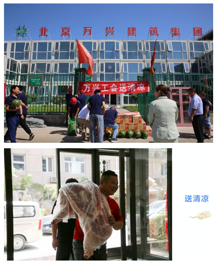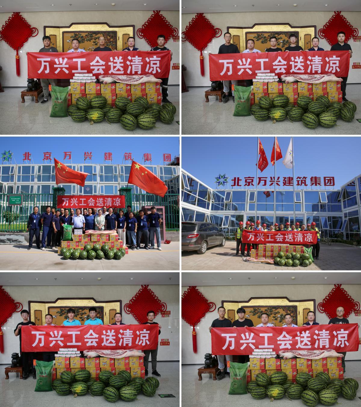 【概要描述】入夏以來,北京持續(xù)高溫,為做好項目一線職工勞動保護和防暑降溫工作,7月6日,萬興集團工會積極開展“送清涼”慰問活動,深入西片區(qū)安置房項目、大興區(qū)檔案館新館項目等10個集團重點在施項目一線,貼心地為一線建設(shè)者送去藿香正氣水、冰紅茶、西瓜、豬肉、綠豆等防暑降溫慰問品,感謝他們?yōu)轫椖拷ㄔO(shè)所付出的辛勤努力。